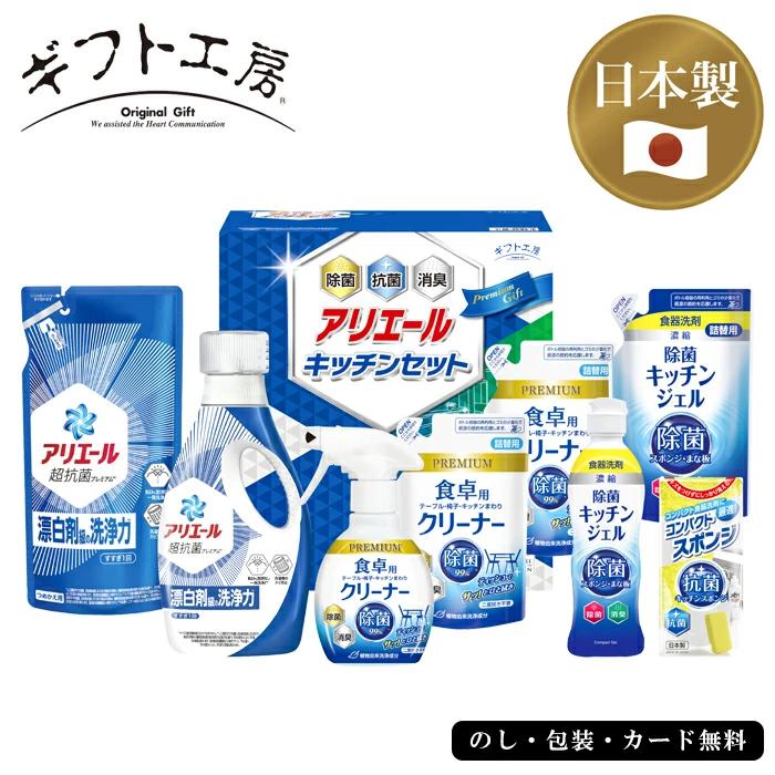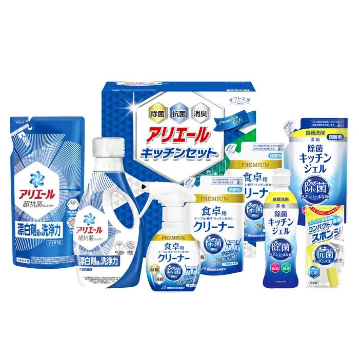 コンパクトスポンジ、P&Gアリエールジェル720g、詰替405g、除菌キッチンジェル200ml、詰替160ml、食卓用クリーナー260ml×各1、詰替250ml×2