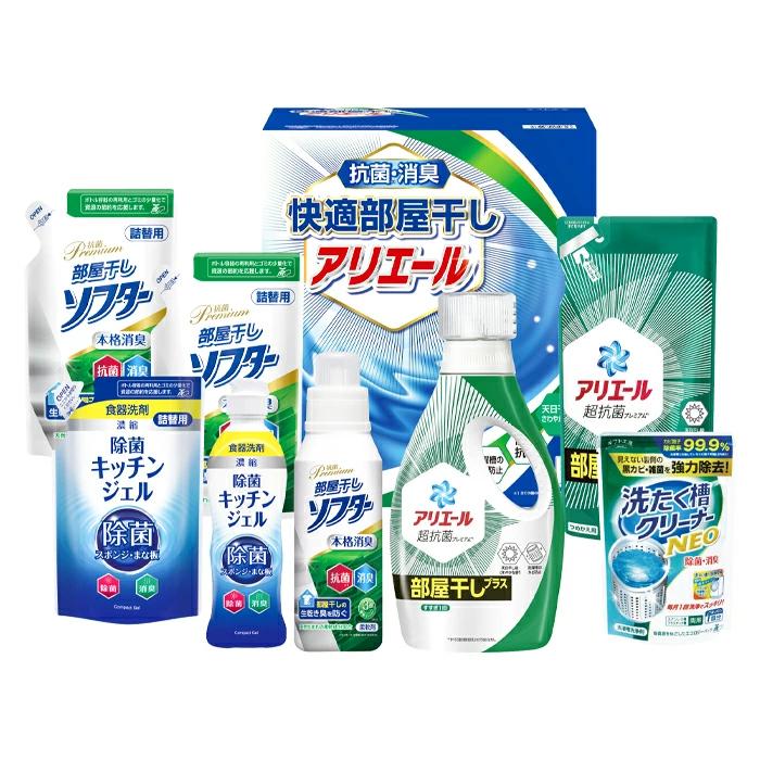 洗たく槽クリーナーNEO100g、P&Gアリエールジェル部屋干しプラス690g、詰替380g、除菌キッチンジェル200ml、詰替160ml、抗菌部屋干しソフター350g×各1、詰替300g×2