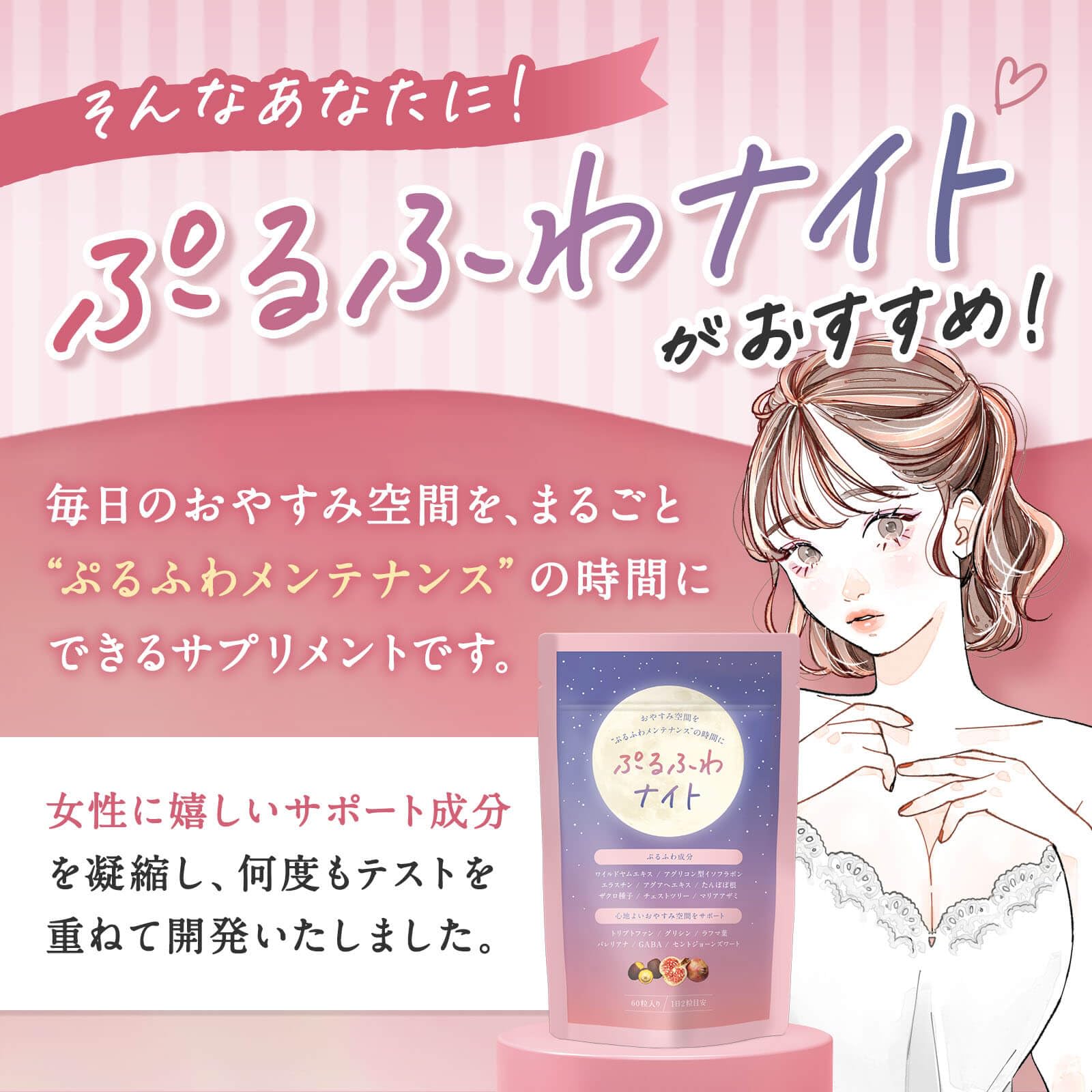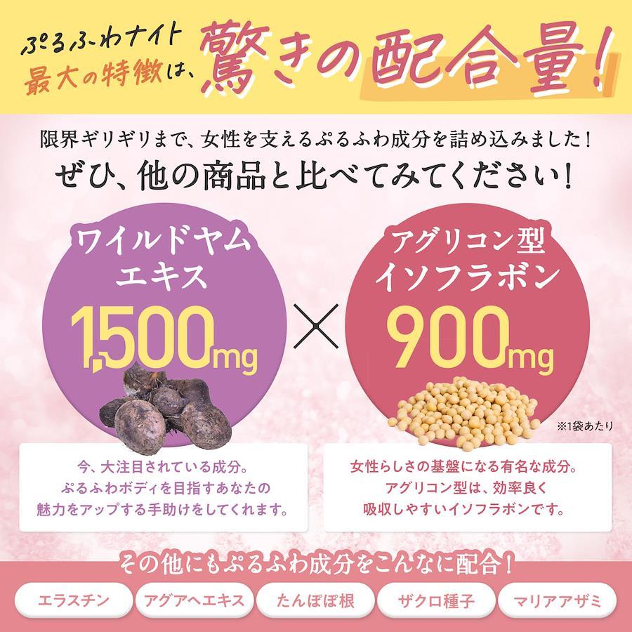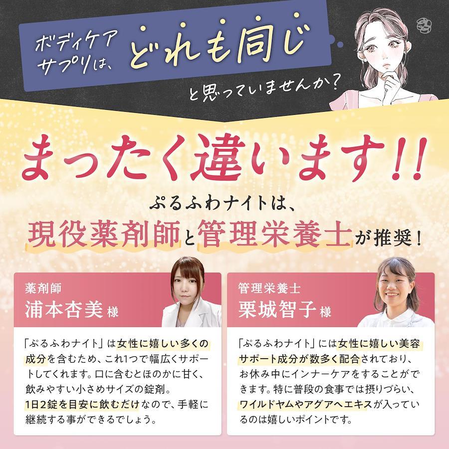 ■サイズ:??16x10x1.5cm;20g 【あなた本来の魅力アップに】 ぷるふわナイトは、インナーケアと心地よいおやすみ空間を過ごして欲しいという想いから生まれました。何度も試験を行い、開発された女性専用サプリメントになります。 【驚きの配合量】 ぷるふわナイトはワイルドヤム(1500mg)アグリコン型イソフラボン(900mg)を贅沢に配合。 あなた本来の魅力を押し上げる2大成分が限界ギリギリまで詰め込みました。 ぜひ、他の商品と比べてみてください! 【おやすみ空間サポートも同時に】 おやすみ空間に最適なトリプトファン、グリシン、GABA、ラフマ葉、バレリアナ、セントジョーンズワート。更に女性に嬉しい美容成分もぎゅぎゅっとひと粒に! 【薬剤師・管理栄養士 推奨のサプリメント】 当サプリメントを開発するにあたり、薬剤師・管理栄養士に推奨をいただいております。 「自分に自信がない」「年齢が気になり始めた」「色気がないと言われる」などお悩みがある方におすすめです!
