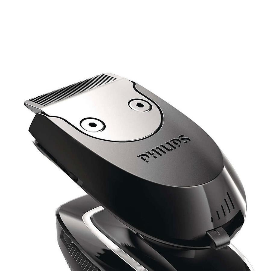 2. ヒゲスタイラーのコームを外して、トリマーで口周りをスタイリング。あご周りのヒゲの形を整える。あごヒゲ上部の輪郭をシャープに見せたいときは、きわぞりトリマーを使うと便利