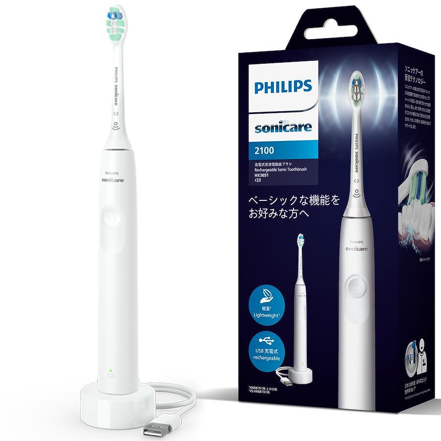 日本の歯科医・歯科衛生士の使用率16年連続No.1の電動歯ブラシブランドから充電式電動歯ブラシ「2100シリーズ」が登場。約30年にわたる研究と開発によって、進化し続けるソニッケアーブランドは、歯科医・歯科衛生士のみなさんに信頼され、長く使い続けられており、ソニッケアーの効果は世界で50を超える大学・研究機関における、175件以上の臨床試験や研究により裏付けられています イージースタート機能搭載でフィリップス ソニッケアーでの歯磨きに徐々に慣れていただけるよう、使いはじめから 14 回目にかけて徐々にパワーを上げていく電動歯ブラシ初心者に対応。 毎分約31,000ストロークの高速振動で歯垢をたたき浮かせ、ブラシヘッドの幅広い振幅で浮かせた歯垢をはらい落とすと同時に、それらの動きが口の中の唾液の流れ「音波水流」を発生させ、やさしく、効果的に歯垢をかき出すサポートをします。 ハンドルデザインは直径(奥行)26mmとスリムで、約97g(クリーンプラスブラシヘッド装着時)と軽量なため、持ちやすく使いやすい電動歯ブラシで初心者にも扱いやすいデザイン カドペーサー機能(時間の区切りをビープ音でお知らせする機能)搭載で30秒毎に時間の区切りをビープ音でお知らせし、口腔内を一定の間隔で均等にくまなくブラッシングするサポート スマートタイマー機能(ブラッシング自動停止機能)により2分間で自動的に停止し、しっかり 2分間磨けると同時に、磨きすぎを防止 USB充電式で、DC5V(USB Type A)電源に対応。満充電で約2週間使用可能 ?【音波水流テクノロジー機能】毎分約31,000ストロークの高速振動で歯垢をたたき浮かし、払い落とし、かき出す ?【ハンドル】持ちやすく使いやすい、スリムで軽く、初心者も扱いやすいデザイン ?【スマートタイマー機能】しっかり 2分間磨けると同時に、磨きすぎを防止する機能搭載 ?【充電&使用期間】USB充電式、満充電で約2週間使用可能 ?【.co.jp限定】色 ホワイト