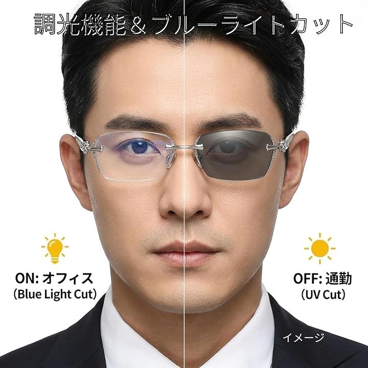 「室内ではPCメガネ、屋外ではサングラスに」 太陽光(紫外線)の強さに合わせてレンズの濃度が自動で変化する調光レンズを採用。