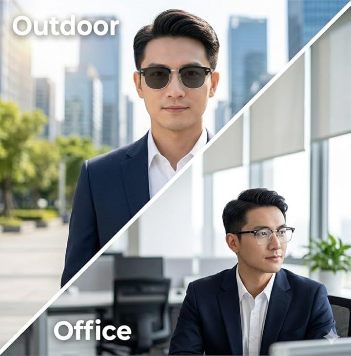 室内ではクリアなPCメガネとして、屋外では眩しさを抑えるサングラスとして、1本で2役をこなします。