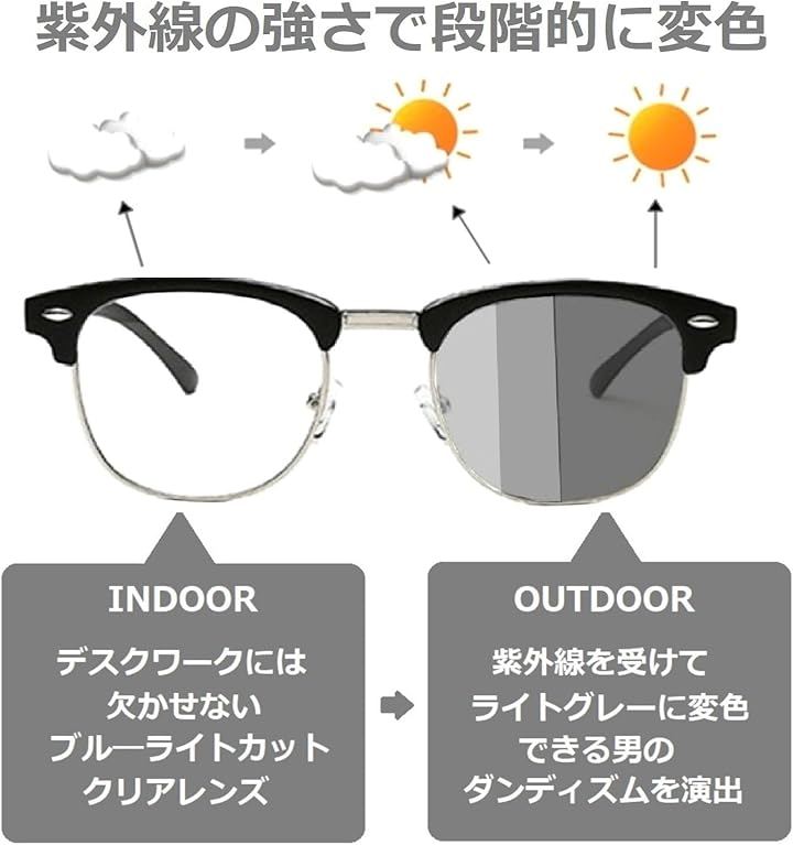 2WAY調光レンズ:紫外線の強さに応じてレンズ濃度が自動変化し、室内ではクリアなメガネ、屋外ではサングラスとして1本で2役をこなします。
