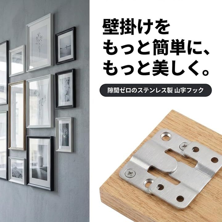 「壁掛けをもっと簡単に」 このステンレス製フックは、絵画や鏡を壁に掛ける際の手間を大幅に軽減します。