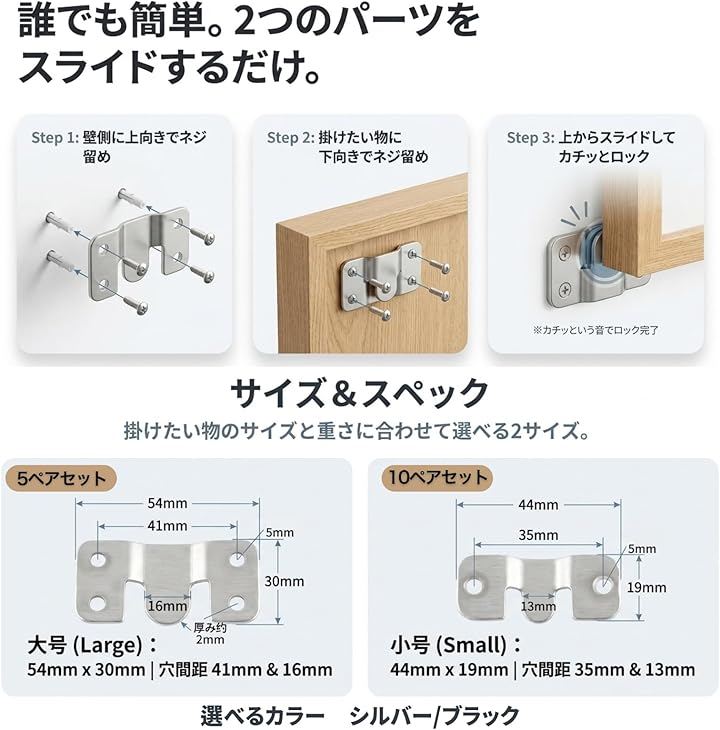 「簡単な取り付け」 フックは2個1セットで、簡単に取り付け可能です。