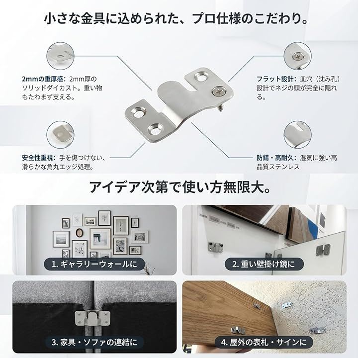 「壁掛けをもっと簡単に」 このステンレス製フックは、絵画や鏡を壁に掛ける際の手間を大幅に軽減します。