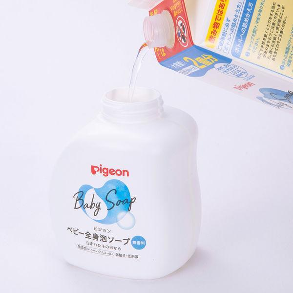 【使用方法】※本品は詰替用です。・適量を手やスポンジにとり、やさしく洗った後、十分にすすいでください。★ボトルへの詰めかえ方(1)キャップを開け、中栓を取り外してください。※爪で中栓を抜くとケガをする恐れがありますのでご注意ください。また、強く引き抜くと液が飛ぶことがありますのでご注意ください。(2)ボトル側面のウィンドウを見ながら、液面ラインまで液を注いでください。※2回分の詰めかえ用なので、一度に全量は入りません。※液を入れすぎると、ポンプに不具合が生じることがあります。※紙パックを強く持つと液が飛び出すことがあるのでご注意ください。(3)キャップをしっかり締めて、紙パックを立てて保管してください。※多湿な場所、直射日光のあたる場所におかないでください。※ポンプが作動しなくなりますので必ずピジョンベビー全身泡ソープ500mLに詰めかえてお使いください。※他のボディソープやシャンプーなどを混ぜないでください。※詰めかえる前に、ボトル容器をよく水洗いし、よく乾かしてください。※詰めかえ後は、ボトルの表示をよく読んでお使いください。※液はうすめずにお使いください。うすめて保管しますと変質することがあります。※本品は紙製容器を使用しているため、持ち運びや保管にご注意ください。※飲み物ではありません。・ごみに出すときは市町村の区分にしたがってください。・詰めかえ後は、この紙パックの上部の製造番号を書き留めておいてください。(製品についてお問い合わせの際、必要な場合があります。)