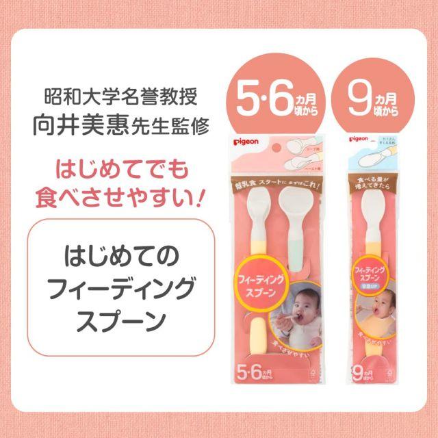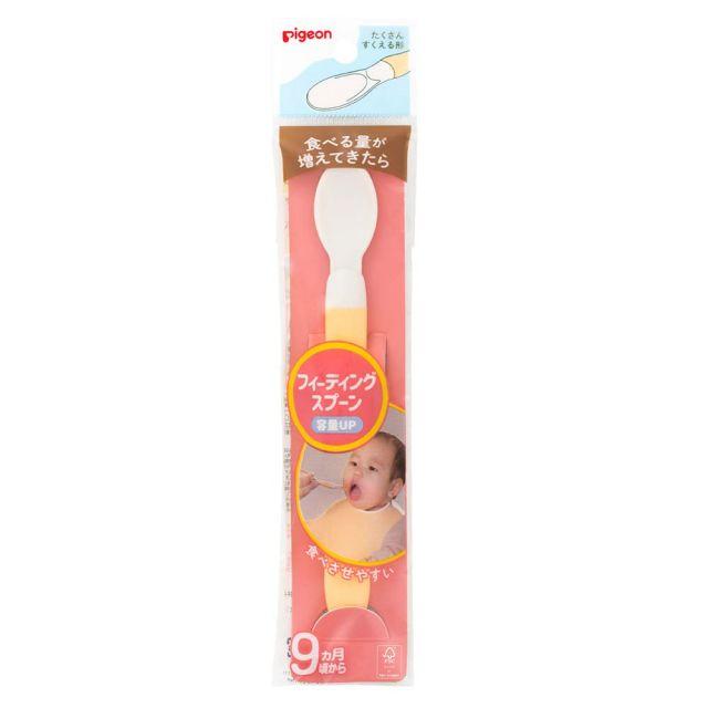 はじめのひとくちにおすすめフィーディングスプーン(容量アップ)赤ちゃんのお口の発達研究から生まれたスプーンです。ムリに食べさせたり、飲ませたりするのではなく、赤ちゃん自身が適切量を食べたり飲んだりできるように促すことができます。●目安付きで奥に入れすぎず取り込みやすい●浅めのスプーンだから唇を閉じる動きを覚えられます●月齢にあった適切な一口がすくえます●小さな赤ちゃんにも安心のやわらか素材9ヵ月頃から〈食べさせ方〉スプーンを下唇の上におき、口が開いて取り込むのを待つ。※口の中までスプーンを入れすぎないことで、舌の動作や飲み込みを妨げずに食べさせられます。上唇がおりてきて取り込めたら、スプーンをゆっくり水平に引き抜く。※上あごに擦りつけないようにしましょう。〈ご使用上の注意〉●必ず保護者がご使用ください。●はじめてご使用になる前に必ず洗浄してください。●にんじん、ほうれん草、かぼちゃ、トマトなどの色素は、付着し乾くと落ちにくいので、ご使用後はできるだけお早めに洗浄してください。食材の色素が付着しても、衛生上は問題ありません。●お手入れの際は、スポンジの柔らかい面で洗浄してください。その後、洗剤はよく洗い流してください。磨き粉やスポンジのかたい面で洗浄すると、キズが付く場合があります。●フィーディングスプーンの先端は、柔らかい素材の為、すり鉢状の食器や、食材の裏ごしへのご使用はお控えください。先端部分が削れてしまうおそれがあります。●火のそばに置かないでください。破損や変形の原因となります。●安全の為、お子様の手の届かない所で保管してください。