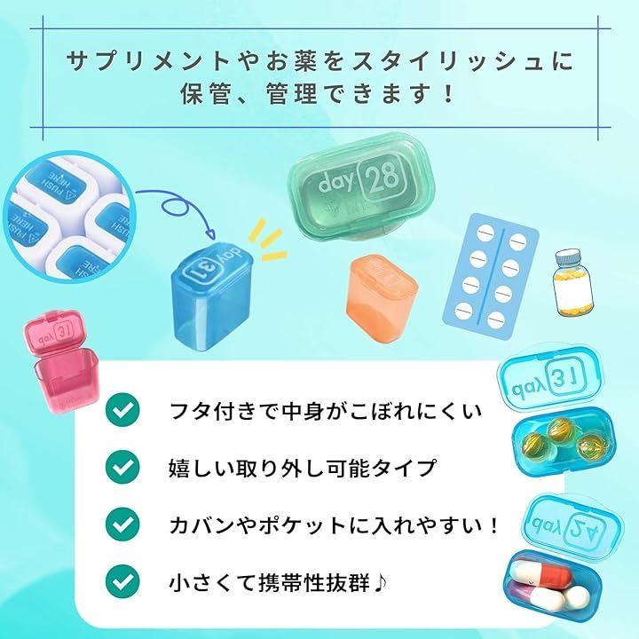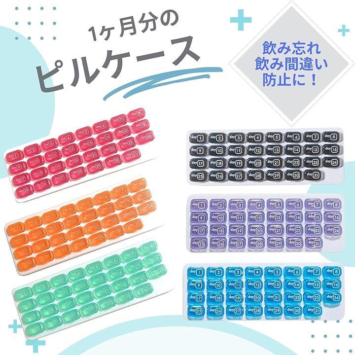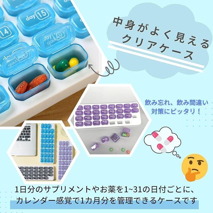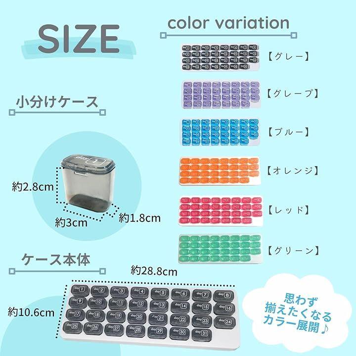 3world ピルケース 1か月 管理 保管 飲み忘れ防止 カレンダー 携帯用 小分け用 選べるカラー 飲み忘れや重複誤飲などでお困りではありませんか?雑多な種類の容器がイヤなミニマリスト様にもおススメ。1ヶ月分のサプリやお薬をコンパクトでおしゃれに管理・保管可能なケースはいかがでしょうか?日付が1~31までプリントされた小分けケースは、通学・通勤・外出時には1個ずつ超コンパクトに持ち歩けるのも嬉しいポイントです。