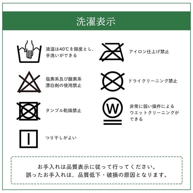 40℃以下の水温で弱い手洗いで洗濯してください。(洗濯機は使用できません。)干し方=日陰のつり干しがよい。