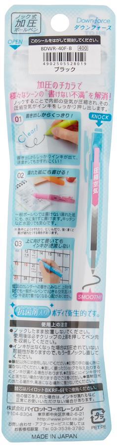 パイロット「ダウンフォース」はノックタイプの加圧ボールペンです。 加圧力により、様々なシーンで「不満を書かれていない」 ノックすることにより、内部の空気が圧縮され、圧縮空気がインクをしっかりと押します。 筆記最初からインクがしっかりと始まるので、 さっと書いても薄くありません。 一般的なボールペンでは書けないウェット紙に書き込めば、水に浸すことなく書けます。 キッチンなど水辺でも安全に使用できます。 カレンダーに書き込むなど上向きに書き込む場合でも、インクの逆流や空気混合は発生しません。 また 本体は抗菌仕様なので、医療現場や公共の場所でも安心してご使用いただけます。