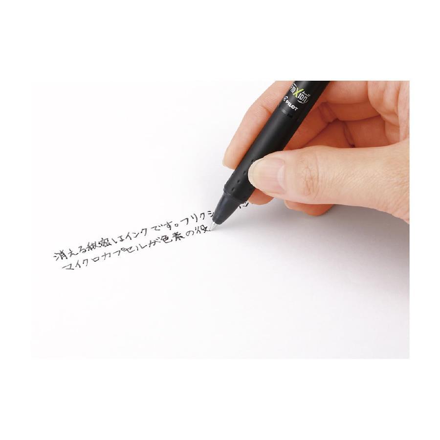 「書く・消す」をスピーディーに。ノック式フリクションボール。書いて、消して、また書ける!※証書類・宛名など消えてはいけないものには使用しないでください。※感熱紙など紙の種類や印刷物の特性によっては消去に不向きな場合があります。