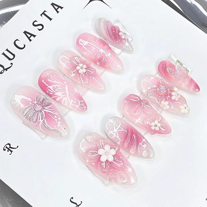 Pink Flower Butterfly Nail Tips, 3D Gradient, Medium Point, Bridal, Wedding, Party, 24-Piece Set with Adhesive Stickers