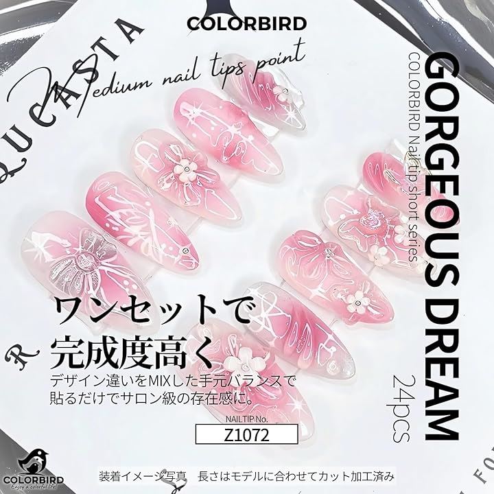 立体的なフラワーパーツと華やかなバタフライデザインが指先を優美に彩ります。