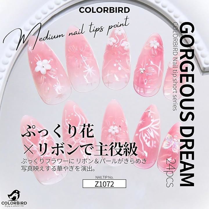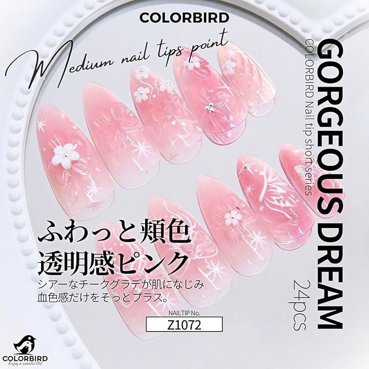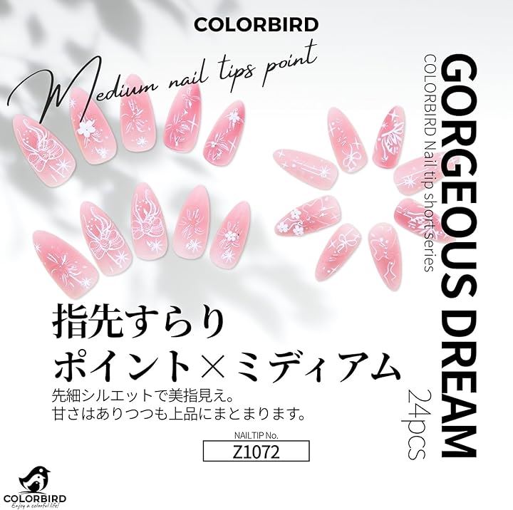 透け感のある優しいピンクに、繊細な花と蝶のモチーフをあしらったミディアムポイントネイルチップ。