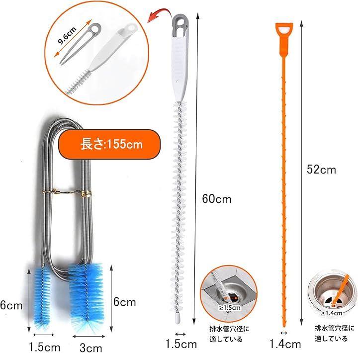「幅広い用途」: 実用的なパイプブラシセットは、ヘアなどの詰まりの解消とパイプの日常掃除の機能をカバーしています。