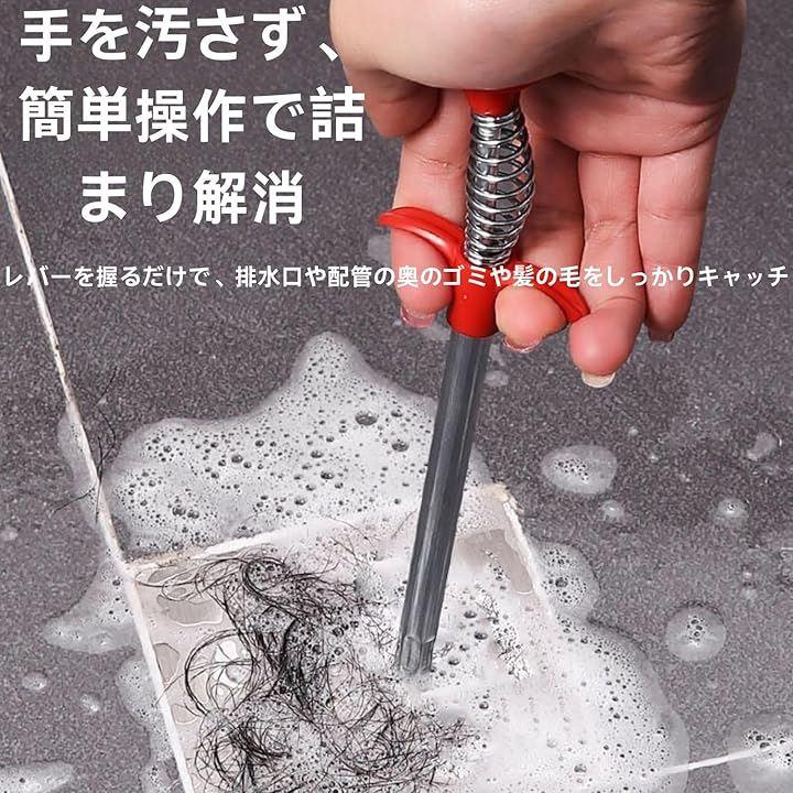 手を汚さず、簡単操作で詰まり解消 レバーを握るだけで、排水口や配管の奥のゴミや髪の毛をしっかりキャッチ。