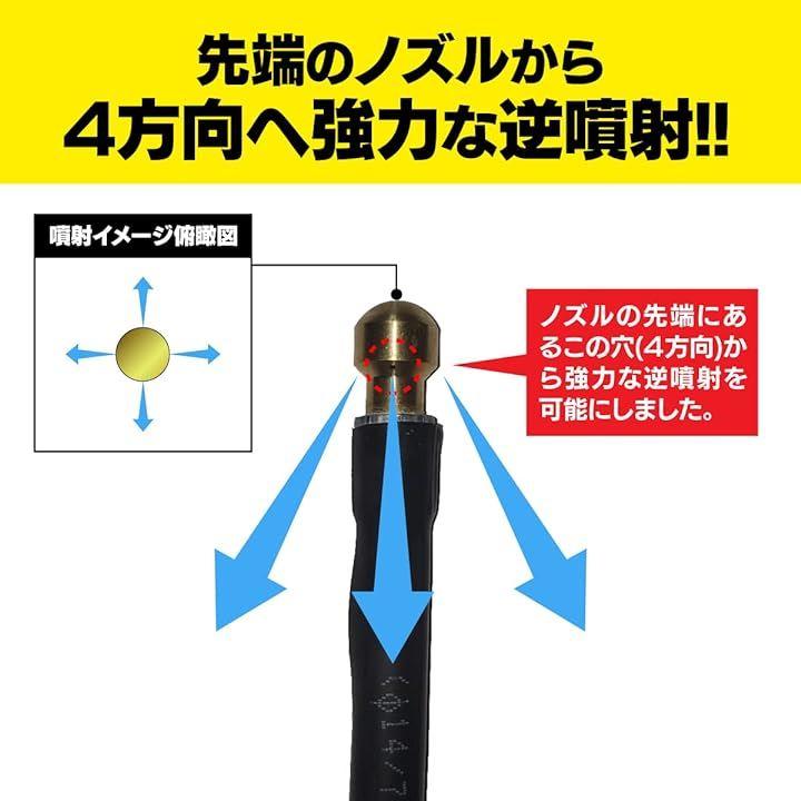 ノズル先端に4方向に4つの高圧噴射口があり、配管に沿って洗浄して進み詰まりを解消します。