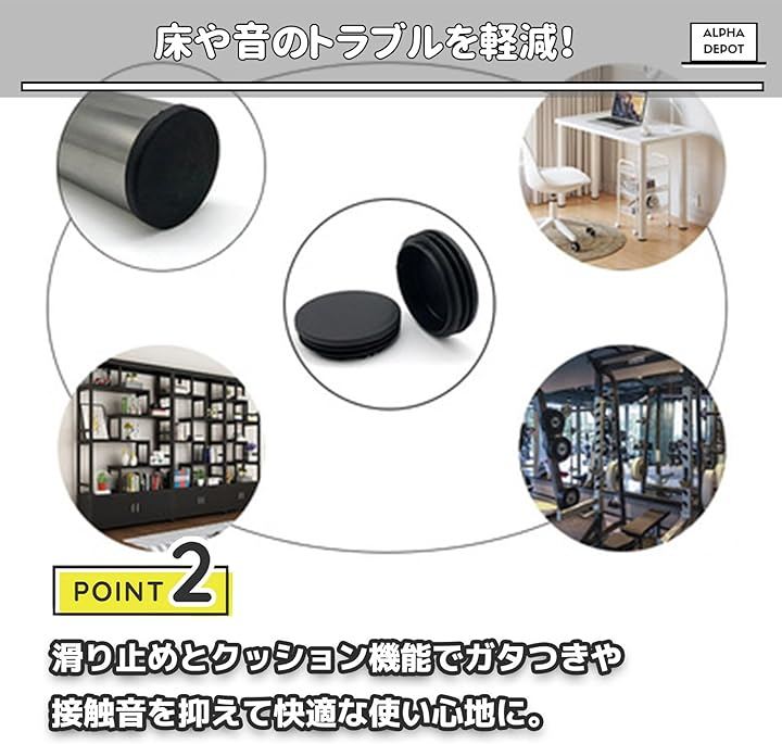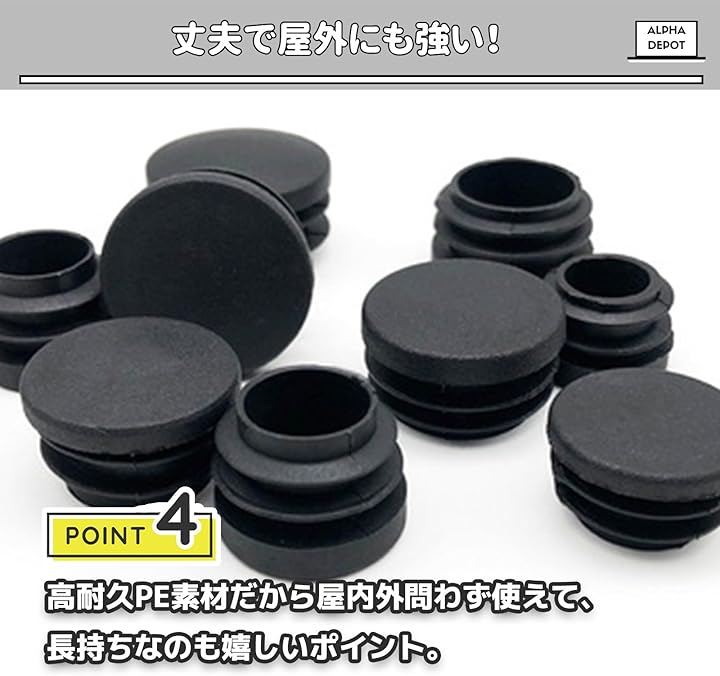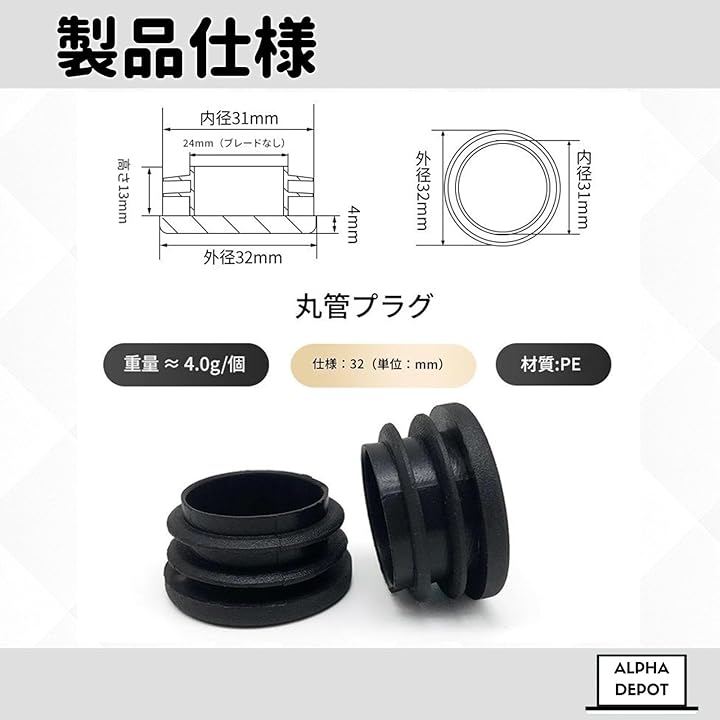 「製品仕様」形状:丸型/対応サイズ:28mm=外形28mm・内径27mm・差し込み深さ14mm・厚み4mm、32mm=外形32mm・内径31mm・差し込み深さ13mm・厚み4mm/材質:PE樹脂/表面処理:マットブラック/用途:家具・パイプ端の保護、滑り止め、防音/包装:複数個入り(サイズ別)