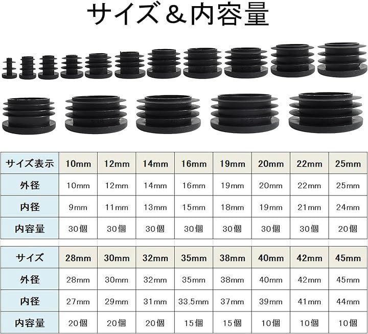 各種パイプに対応する豊富なサイズ展開。 パイプエンドカバーキャップは、(外径/内径)(10mm/9mm)、(12mm/11mm)、(14mm/13mm)、(16mm/15mm)、(19mm/18mm)、(20mm/19mm)、(22mm/21mm)、(25mm/24mm)、(28mm/27mm)、(30mm/29mm)、(32mm/31mm)、(35mm/33.5mm)、(38mm/37mm)、(40mm/39mm)、(42mm/41mm)、(45mm/44mm)と、実に16種類のサイズを取り揃えています。