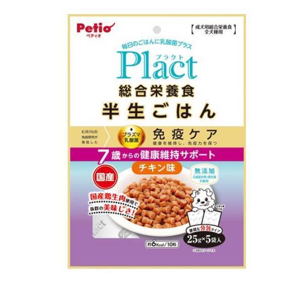 製品の特徴●ペティオ Plact 総合栄養食 半生ごはん シニア犬用 7歳からの健康サポート チキン味 PGS-1●Plact(プラクト)は、ペットの健康を考えて乳酸菌をプラスしたブランドです。●毎日のごはんに乳酸菌プラス。KIRIN(キリン)の免疫研究が発見したプラズマ乳酸菌配合。健康を維持し、免疫力を保つ”免疫ケア”。●トッピングやしつけのご褒美にも適した成犬用セミモイストフード。●国産鶏生肉使用で、抜群のおいしさ!●プラズマ乳酸菌による免疫ケアに加えて、高齢犬のために4つの健康維持サポート!◇お腹ケア:水溶性食物センイ(難消化性デキストリン)・オリゴ糖配合。◇骨・歯ケア:カルシウム配合。◇皮膚・被毛ケア:コラーゲン配合。◇関節ケア:N-アセチルグルコサミン・コンドロイチン配合。●10粒当り約6kcal。●小粒タイプなのでトッピングやしつけのご褒美にもオススメ。●合成着色料・発色剤 無添加。●便利な分包タイプ。●名称:ドッグフード(成犬用総合栄養食)全犬種用●内容量:125g(25g×5袋)●原産国名:日本(国産品)●ペットフード/犬いぬイヌ/主食/餌えさ/おやつ/間食