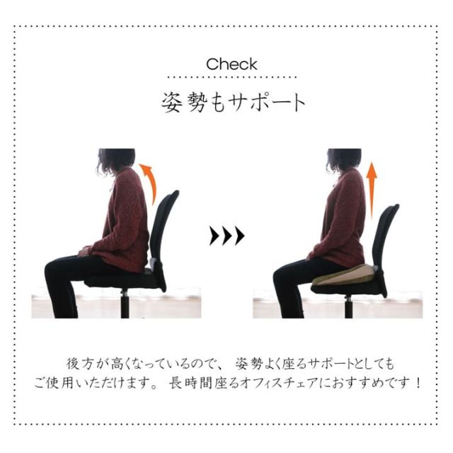 "オフィスチェアにおすすめです。家やオフィスで座るときのお尻への負担を軽くするサポートクッションです。円座タイプになっておりますので通気性もよく快適です。後方が高くなっていますので姿勢よく座るサポートとしてもご使用下さい。シンプルなデザインなので、お部屋のテイストを問いません。もちもちな感触でお尻や腰への負担をやわらげてくれます。なめらかな肌触りの生地を使用しているので季節を問わずオールシーズンご使用頂けます。