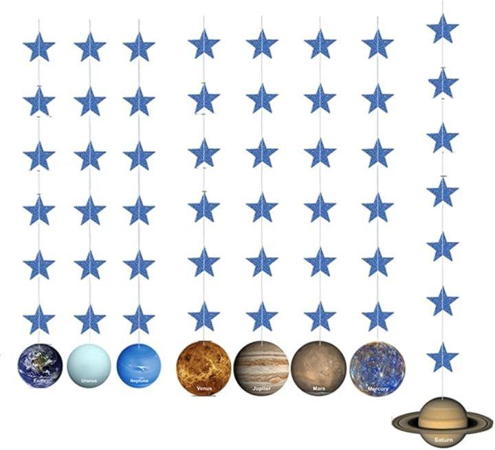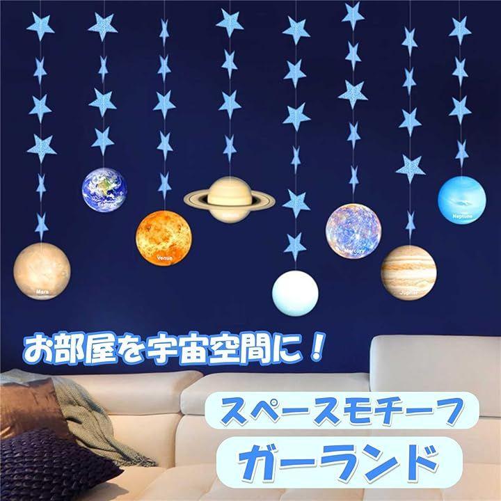 お部屋を宇宙空間に。青い星に惑星が連なったスペースモチーフのガーランドです。