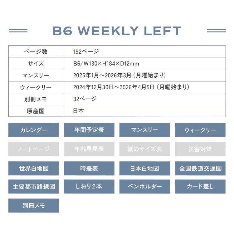 【B6 ウィークリー・レフト】小さなワンポイントが可愛いウィークリー手帳。プライベートはもちろん、仕事でも使えるシンプルなデザイン。コンパクトなサイズ感でありながらも書き込みスペースも広く使いやすいB6サイズです。ウィークリーページは時間軸付きで、1日の予定が時間単位で細かく書き込めます。右ページはドット方眼のメモを配置。文章を書いたり、イラストを描いたりする時に便利なガイドとして機能します。