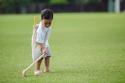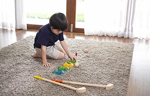 木のぬくもりが感じられる、子供用のゴルフセット。子ども用のクラブ2本、木製ボール2個、3種類のコースとホールが入っている。収納用の布製バッグ付き。