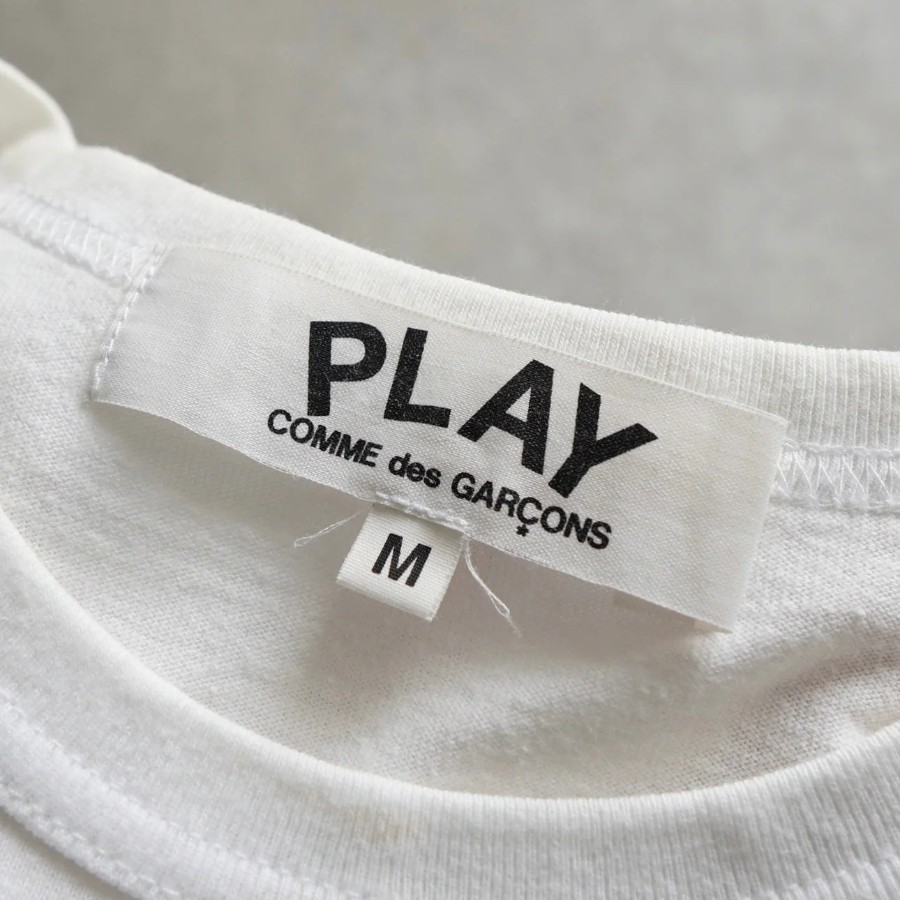 プレイ コムデギャルソン ロゴ Tシャツ ホワイト | Brand: PLAY COMME des GARCONS | Category: T-shirt / Top | Color: White | Material: コットン100% | Condition: Good+ | Condition Notes: 首元に多少の黄ばみがみられますが、汚れ等は見当たらないコンディションです。(タグより後の写真参照) | Size: 表記サイズ:M 目安サイズ:メンズS / レディースM 程度 ※あくまで目安ですので参考程度でお考えください 肩幅:約38cm 身幅:約42.5cm 着丈:約55.5cm 袖丈:約18cm | Details: AD2012 / 日本製