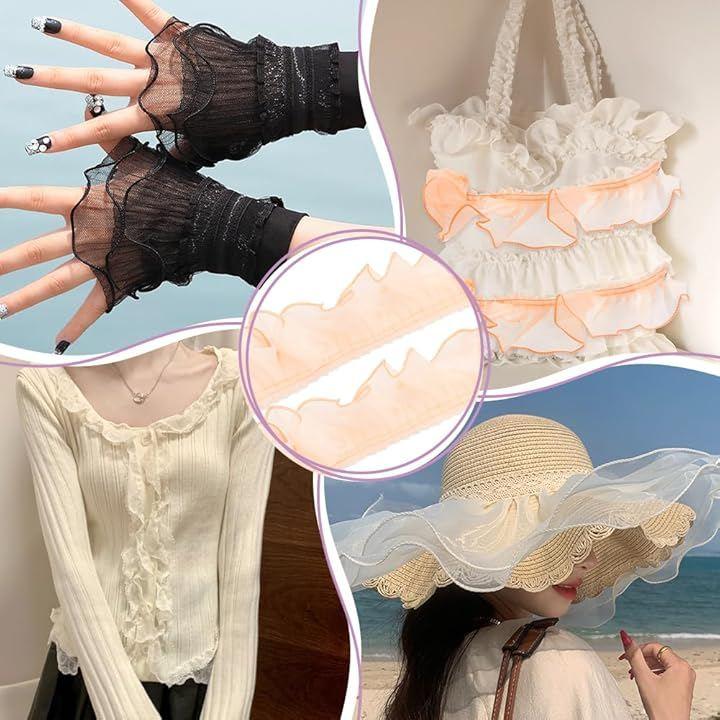 デザイン:レーストリムはフリルプリーツ形で、その立体効果によって、衣服をよりデザイナー風に見せ、レースがエレガントな雰囲気を出します。