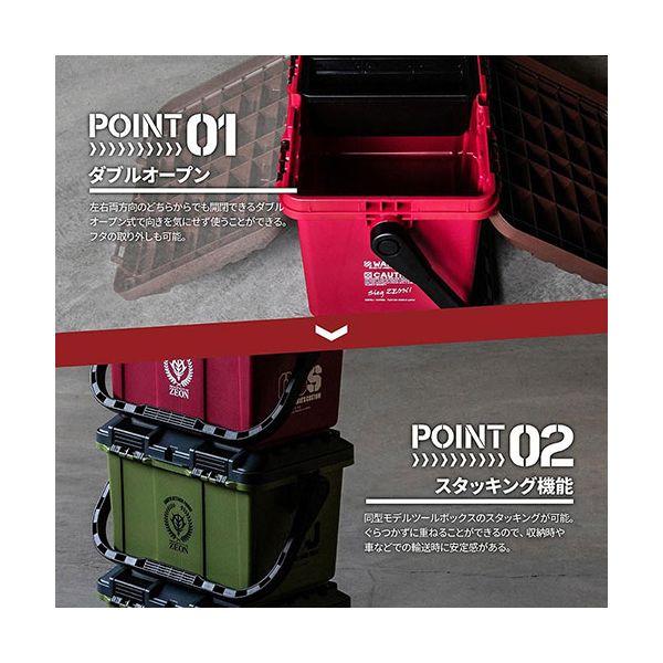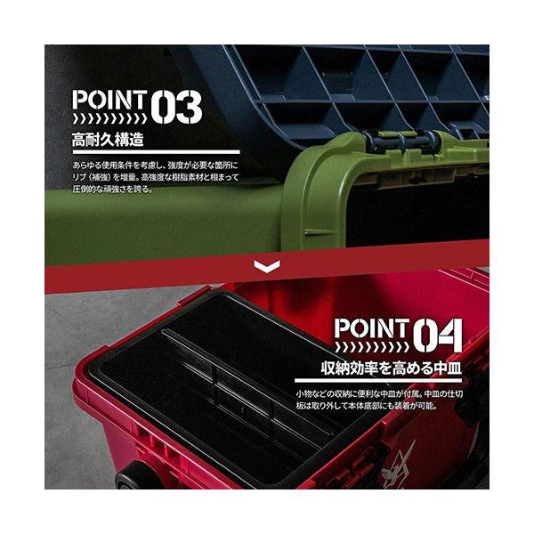 ジオン公国軍の支給品をイメージした、使い方を選ばないタフなツールボックスです。耐久性に優れる高強度樹脂を本体素材に採用し、工具箱やアウトドアグッズの収納として活躍します。