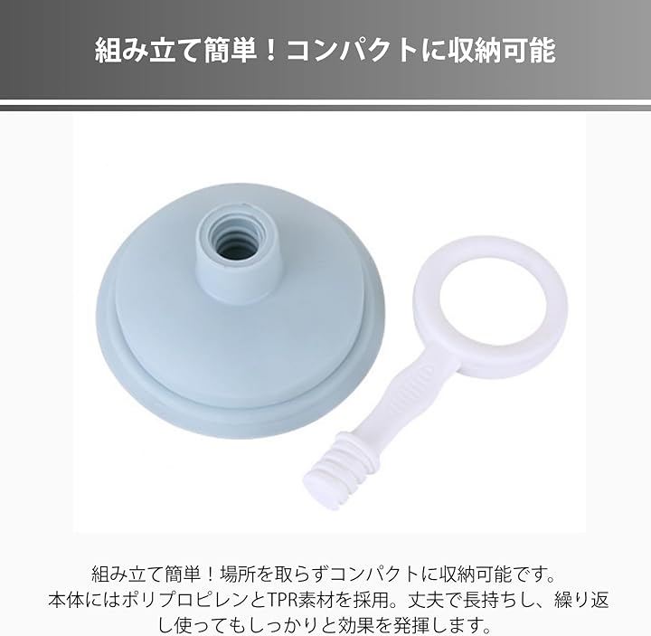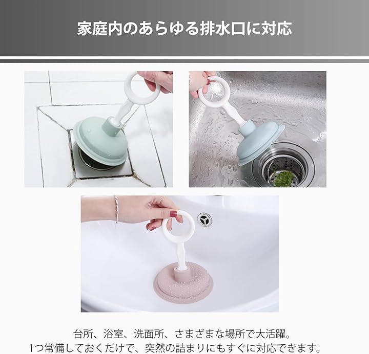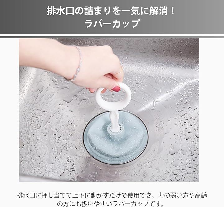 排水口に押し当てて上下に動かすだけで使用でき、力の弱い方や高齢の方にも扱いやすい設計です。