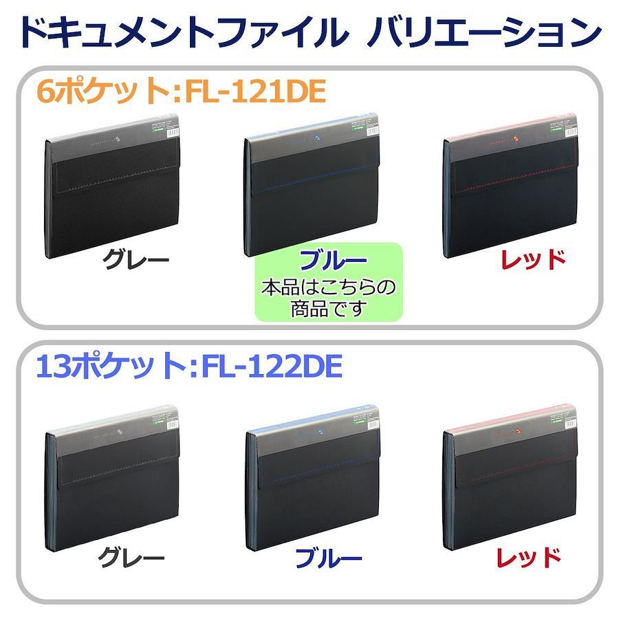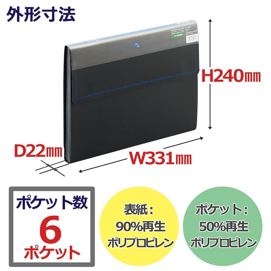 書類の1週間16日分の仕分けに便利な6ポケット。規格:A4 / 品番:FL-121DE / カラー:ブルー外形寸法:縦331×横240×背幅22mm / 差し替えられる背ラベル付面ファスナーで開閉。外側に突起物が無いので、そのまま持っても、鞄にいれるのもスムーズ。材質:ブラック表紙=90%再生ポリプロピレン(PP)シート0.6mm厚、クリアーポケット=50%再生ポリプロピレン(PP)シート0.2mm厚【免責事項】メーカーによる商品リニューアルに伴いパッケージが変更が行われた場合、新パッケージでお届け致します事ご了承願います。