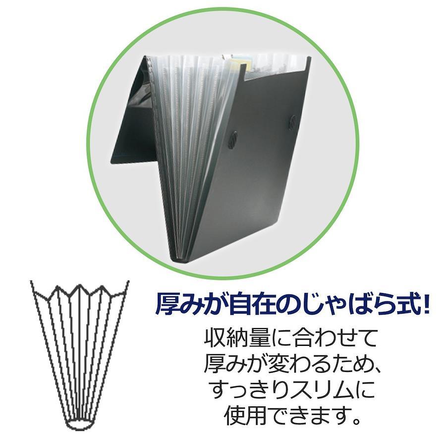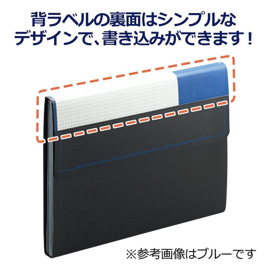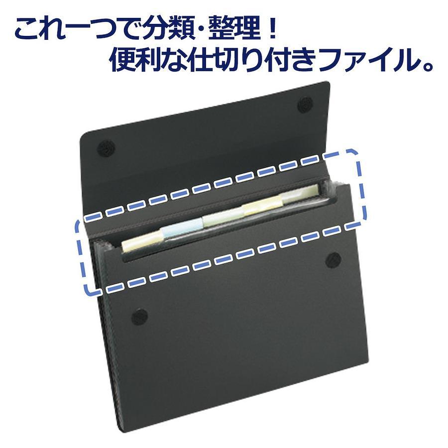 ・ブラックの落ち着いたデザイン本体カラーのブラックをベースに表紙と背ラベルにアクセントをつけた、シンプルで落ち着いたデザインです。・優れたコストパフォーマンス生産過程や材料調達を見直し、お求めやすい価格を実現。オフィスのコスト削減に役立ちます。・書類と不定形な小物などを一緒に保管できる小分けポケットファイル。・ポケットにはラベルを差替えられる見出し付き。