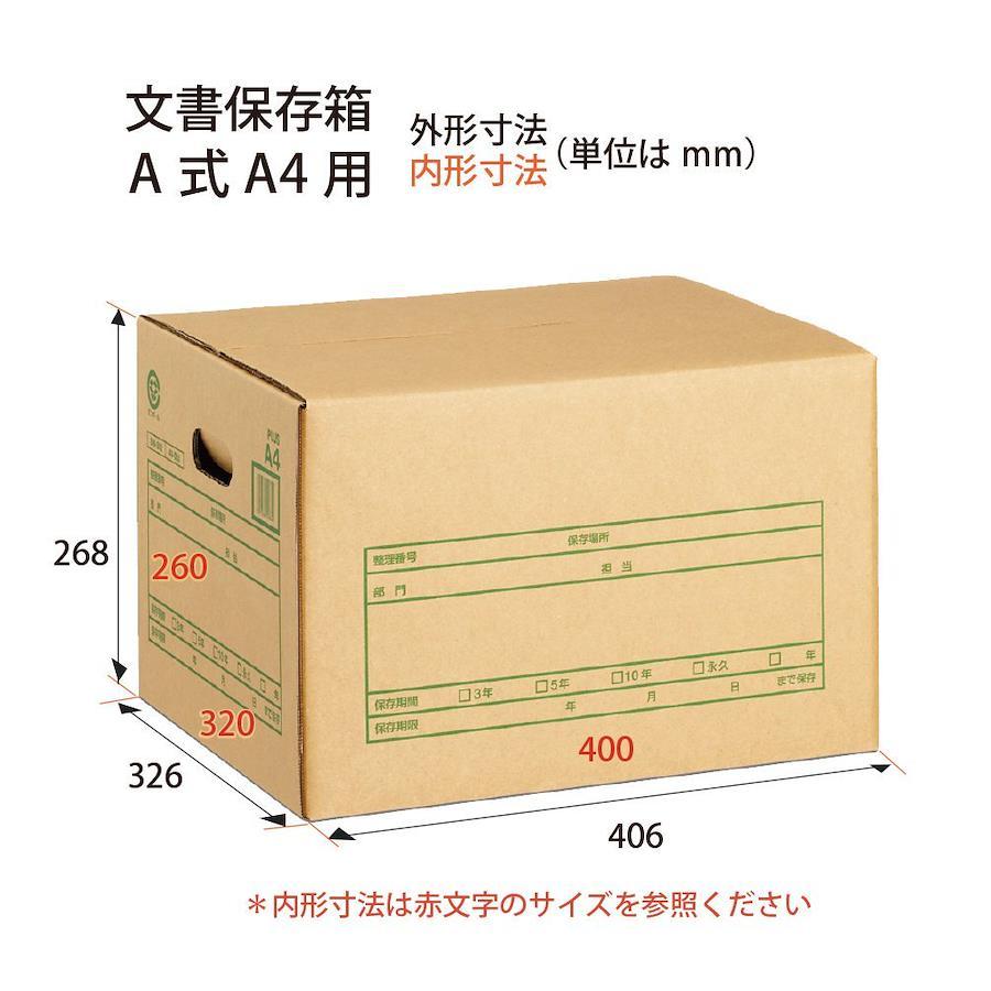 ・オフィスで、ご家庭で、書類だけでなく、さまざまなものの整理収納に・ナチュラルなクラフト段ボールに、内容表示などの記入欄が印刷されています・主ファイリング用途向けの、保存箱です・紙の重さを考慮して耐荷重は20kg、4段まで積むことができます・内寸が320×400×260mmですので、A4のファイルやボックスが入るサイズです・環境に配慮した古紙パルプ配合率90%再生紙のダンボールですので、グリーン購入法適合製品です