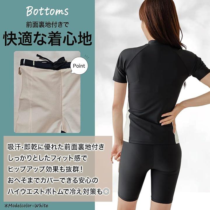 美シルエット。シンプルでお洒落な縦ラインで、ほっそり視覚効果。露出少なめの二の腕と脇を隠せる半袖タイプでスイムに集中。ハイウエストだから気になるお腹もしっかりカバー。
