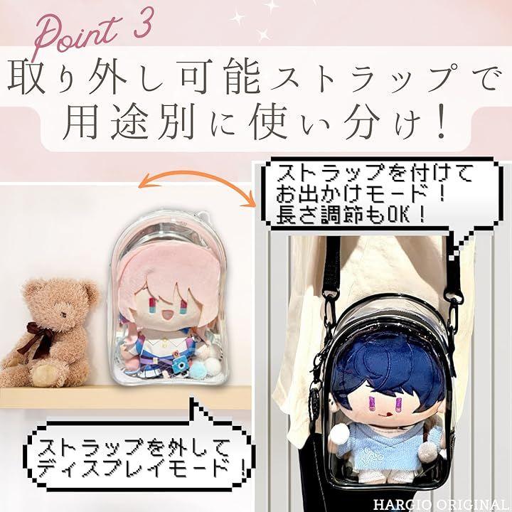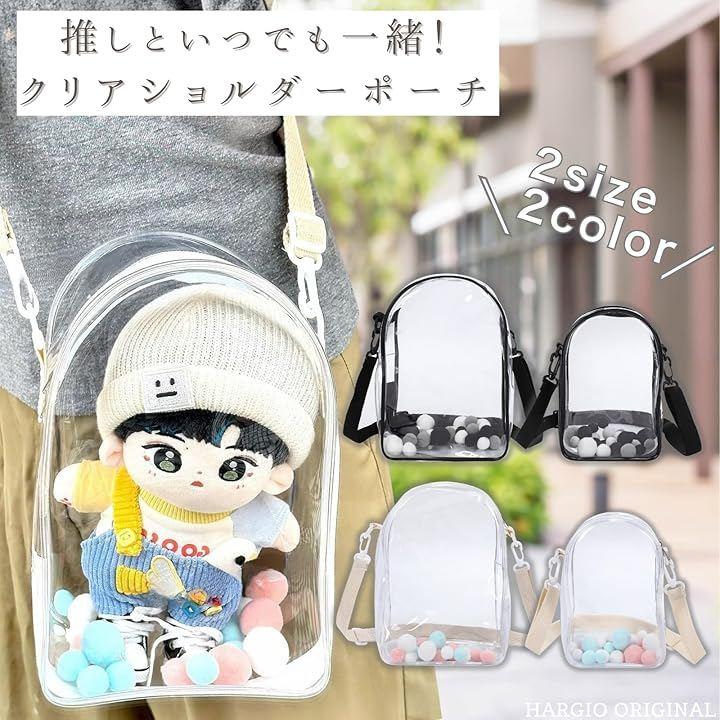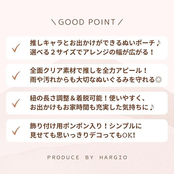 シンプルで可愛いデザインが魅力のぬいポーチ.大き目サイズの全面透明でぬいぐるみが映え、推しキャラとお出かけができるバッグです。