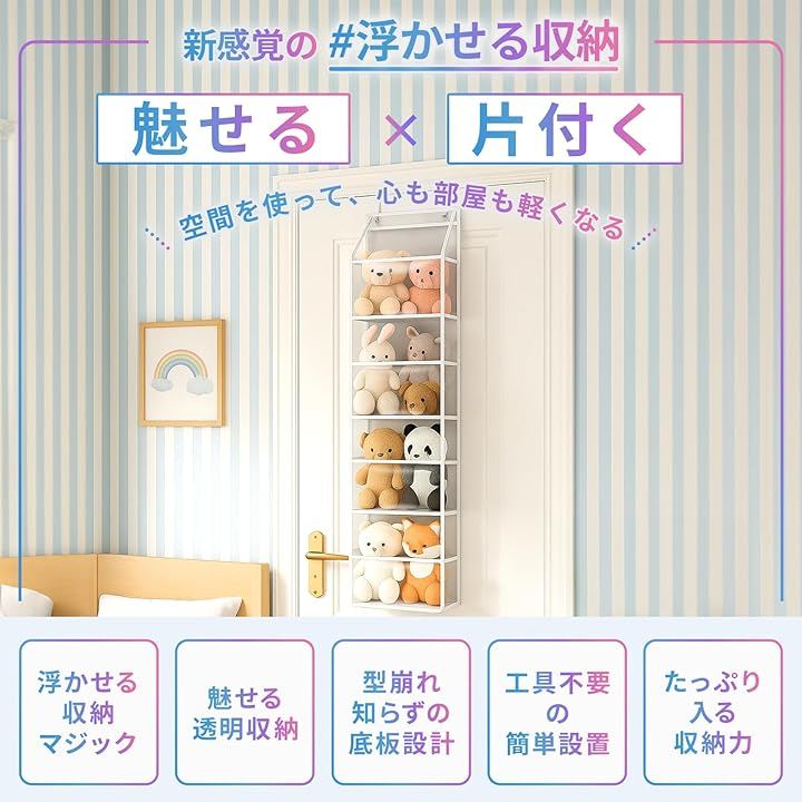 絶妙な透明収納で隠さない美しさ - 厚さ5mmの縦開きポケットでお気に入りをすぐ取り出せ、高品質の厚手PVC素材だから透明度抜群でぬいぐるみや推しグッズをショーケースのように美しく見せます