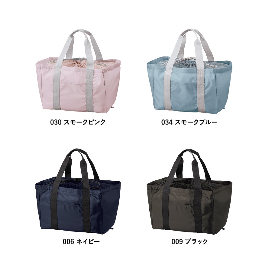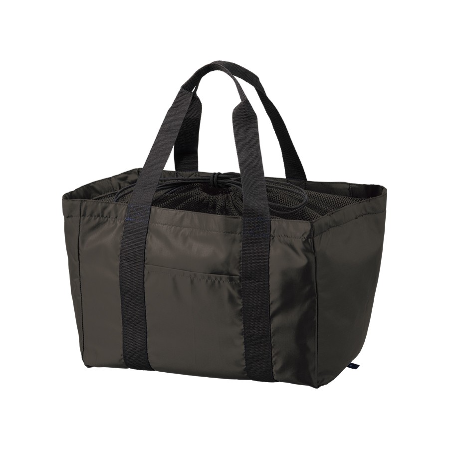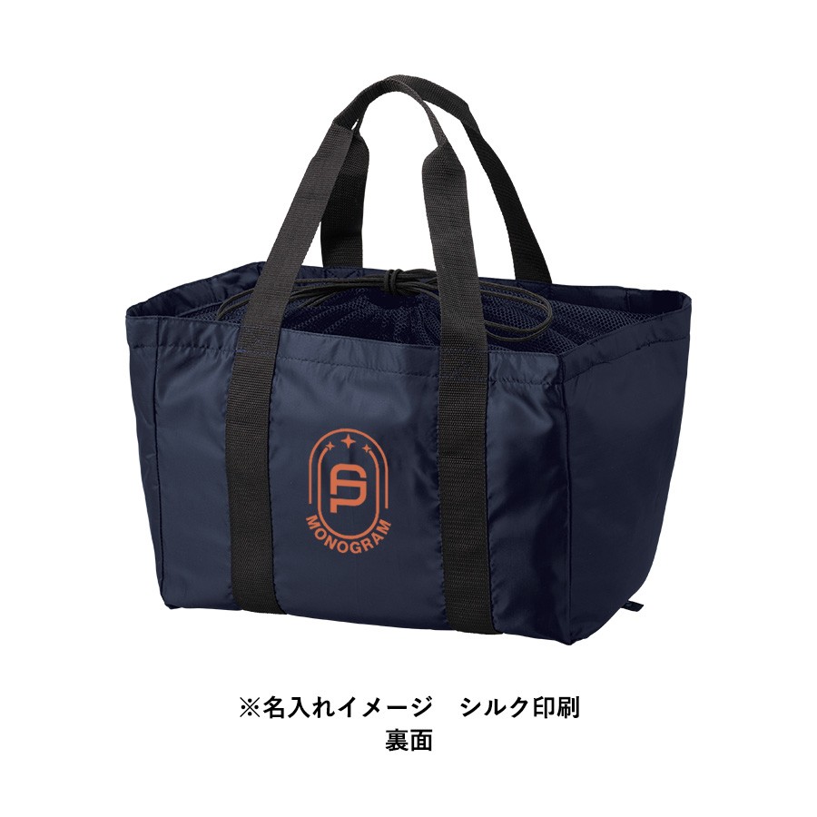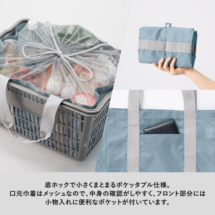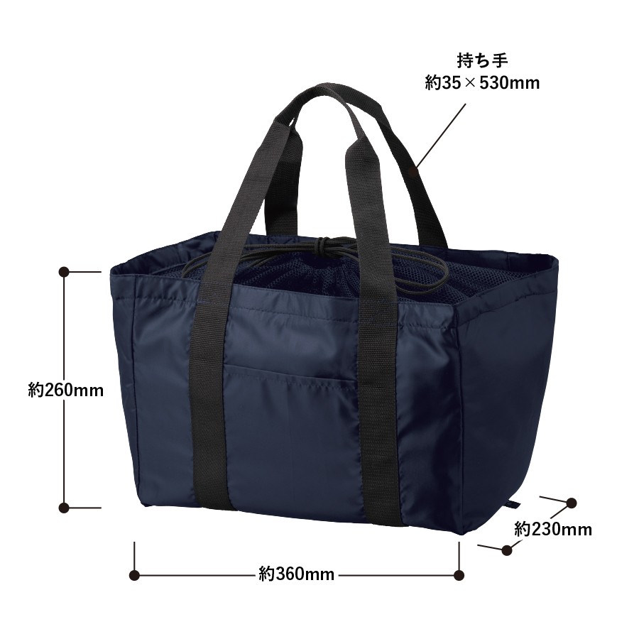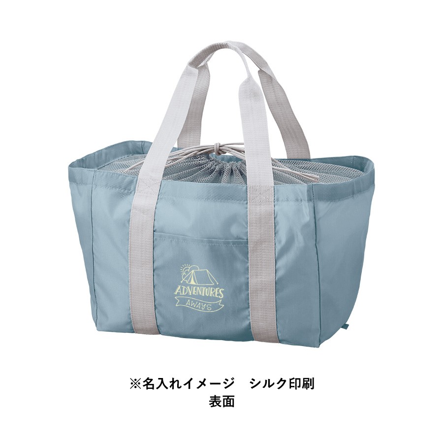 軽くて持ち運びしやすいポケッタブル仕様のレジカゴトートです。大容量ながら、底ホックで小さくまとめることのできるポケッタブル仕様で持ち歩きにも便利です。巾着のサイド部分は切れ目が入っており、大きめのレジカゴにも引っ掛けやすいので様々なサイズのレジカゴに対応できます。口元巾着はメッシュになっているので、中身を確認しやすいのもポイントです。またフロントポケット付きなので、小物を入れて荷物と分けておくことができます。フルカラー印刷にも対応しているおり、お店の購入特典や高級ノベルティはもちろん物販品としてもおすすめです。