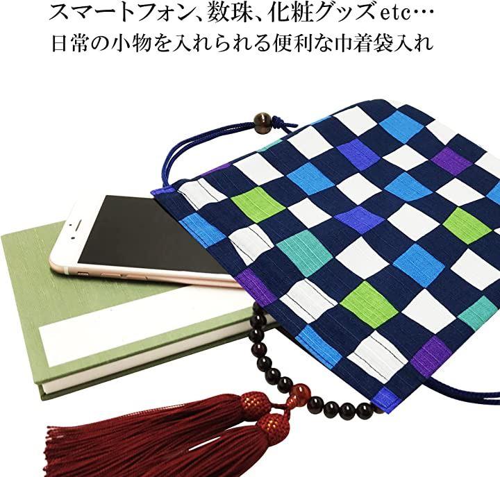 スマートフォン、マスク、化粧グッズ、数珠などアイデア次第でいろいろなものを便利に収納できる、小物用袋入れです。