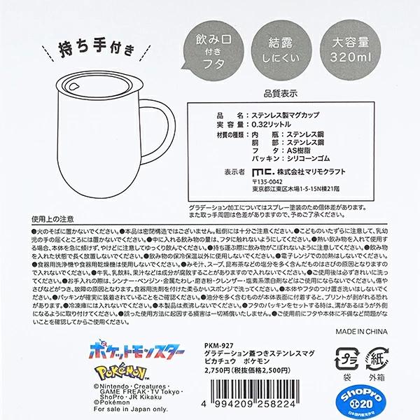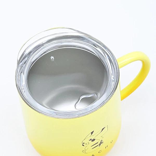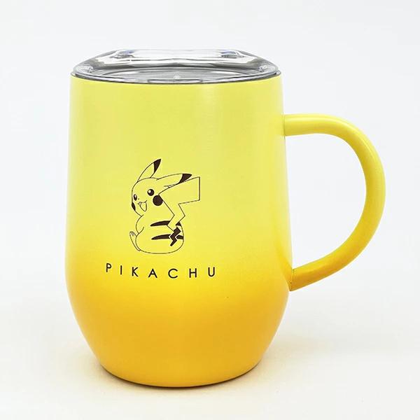 ピカチュウの蓋付きステンレスマグです。冷たい・温かい飲み物両方OK!おしゃれなグラデーションカラー♪飲み口にはフタがついていてこぼれにくい。持ち手も付いていて持ちやすく大容量!ふた付きなので、オフィスでも使いやすい♪ 【容量:320ml】※電子レンジ・食洗機 使用不可!