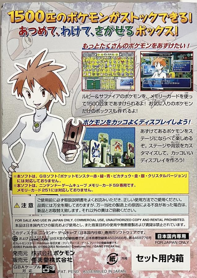 「もっとバトルが強くなりたい」「もっといろんなポケモンを集めたい」というポケモンユーザーのために、NINTENDO GAMECUBEでポケモンを管理できるお役立ちツールが登場。GAME BOY ADVANCEソフトの『ポケットモンスター ルビー』、『ポケットモンスター サファイア』で持ちきれなくなったポケモンを、GBAケーブル経由でGCのメモリーカード59に預けられる。