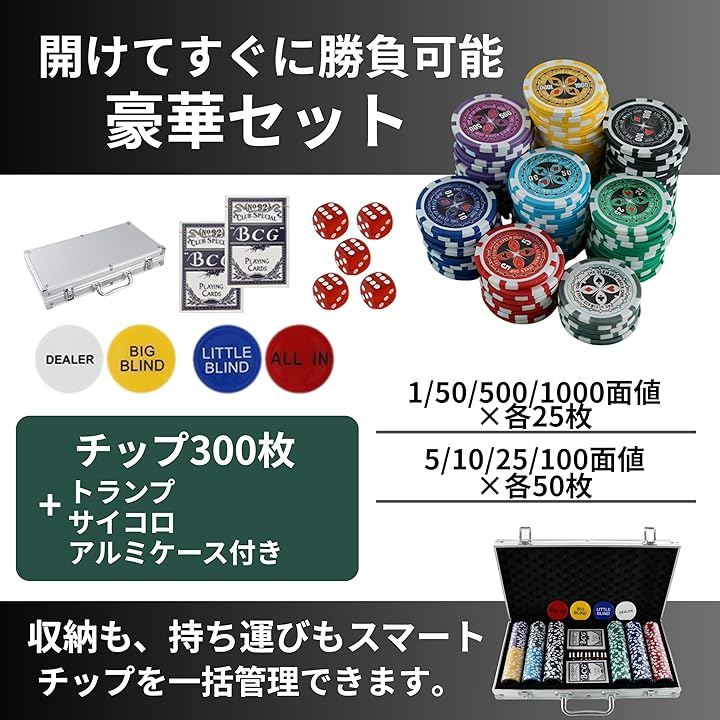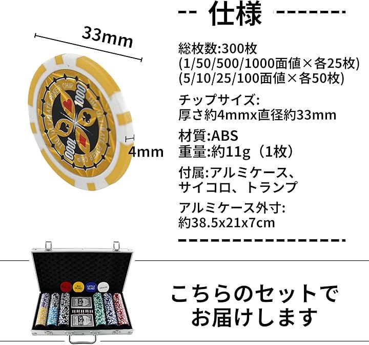 「仕様」 総枚数:300枚 面値配分:1x25枚/5x50枚/10x50枚/25x50枚/50x25枚/100x50枚/500x25枚/1000x25枚 チップサイズ:厚さ約4mmx直径約33mm 材質:ABS 重量:約11g(1枚) 付属:アルミケース、サイコロ、トランプ アルミケース外寸:約38.5x21x7cm
