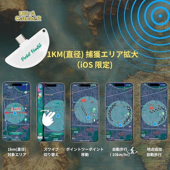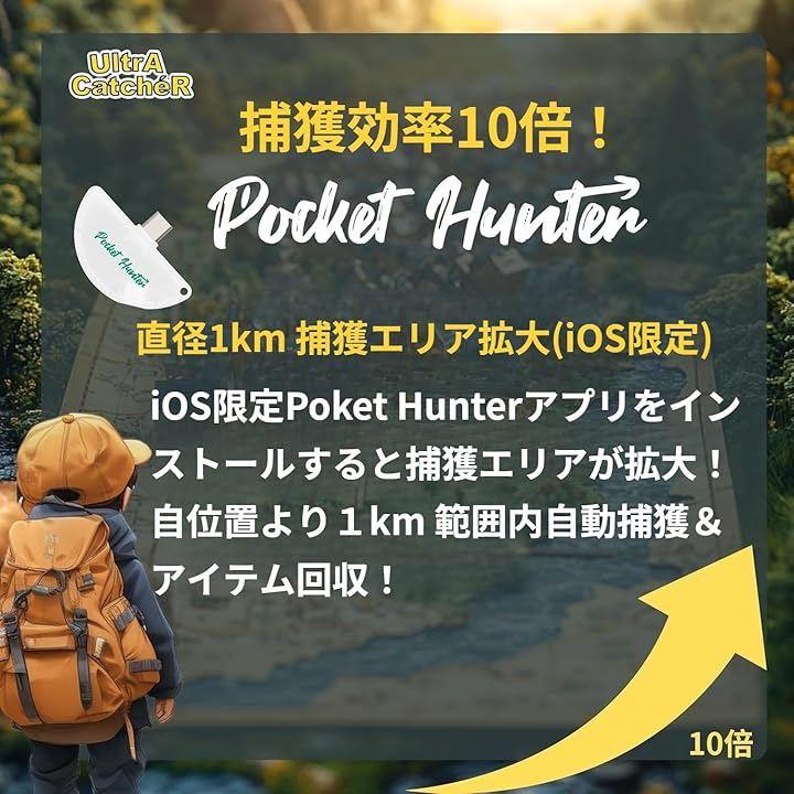 「[iOS Type-C]用 捕獲効率10倍。・捕獲エリア拡大版 スマホ一体型オートキャッチャー」 iOS限定Poket Hunter専用アプリをインストールすると捕獲エリアが拡大。自位置より1km範囲内(半径500m)で自動で捕獲、アイテム回収。*Poket Hunter専用アプリはiOSのみとなります。