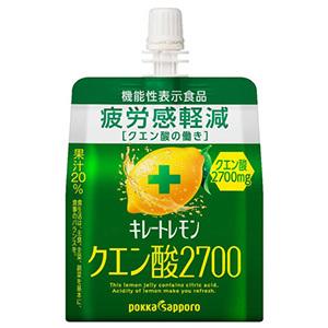■商品概要メーカー:ポッカサッポロフード&ビバレッジ商品名:【軽】キレートレモン クエン酸2700ゼリー(165g)区分:食品内容量:165g商品概要:【機能性表示食品】レモン1個分の果汁、1日分のビタミンCJANコード:4589850822568商品コード:125005391■商品の特徴レモン1個分(※1)の果汁、1日分のビタミンC(※2)、すばやくエネルギーになるブドウ糖、継続的な飲用で日常生活や運動後の疲労感を軽減するクエン酸(機能性関与成分)が2700mg入った「機能性表示食品のレモンゼリー」です。レモンの酸味でリフレッシュでき、忙しくても前向きに活動したい女性の毎日を応援します。※1 レモン1個分=レモン果汁約30mlとして1本当り1個分以上の果汁が含まれています。※2 1日分のビタミンC=栄養素等表示基準値(2015年版)より【届出表示】本品にはクエン酸が含まれます。クエン酸は継続的な飲用で日常生活や運動後の疲労感を軽減することが報告されています。■機能性関与成分クエン酸2700mg■原材料/成分/素材/材質レモン、果糖ぶどう糖液糖、寒天、レモン果皮エキス/酸味料、クエン酸K、乳酸Ca、ビタミンC、ゲル化剤(増粘多糖類)、甘味料(アセスルファムK、スクラロース)、香料、紅花色素、乳化剤■栄養成分1袋(165g)当たり:エネルギー27kcal、たんぱく質0g、脂質0g、炭水化物7.4g、食塩相当量0.54g、ビタミンC 110~295mg、クエン酸2700mg、カリウム333mg、リン4mg、カフェイン1mg未満■賞味期限/使用期限(製造から)9か月■メーカー希望小売価格(税込)194円■発売元/製造元/輸入元ポッカサッポロフード&ビバレッジ■お問い合わせ先ポッカサッポロフード&ビバレッジ(株) お客様相談室0120-885547受付時間 10:00 ~ 16:00(土日、祝日を除く)
