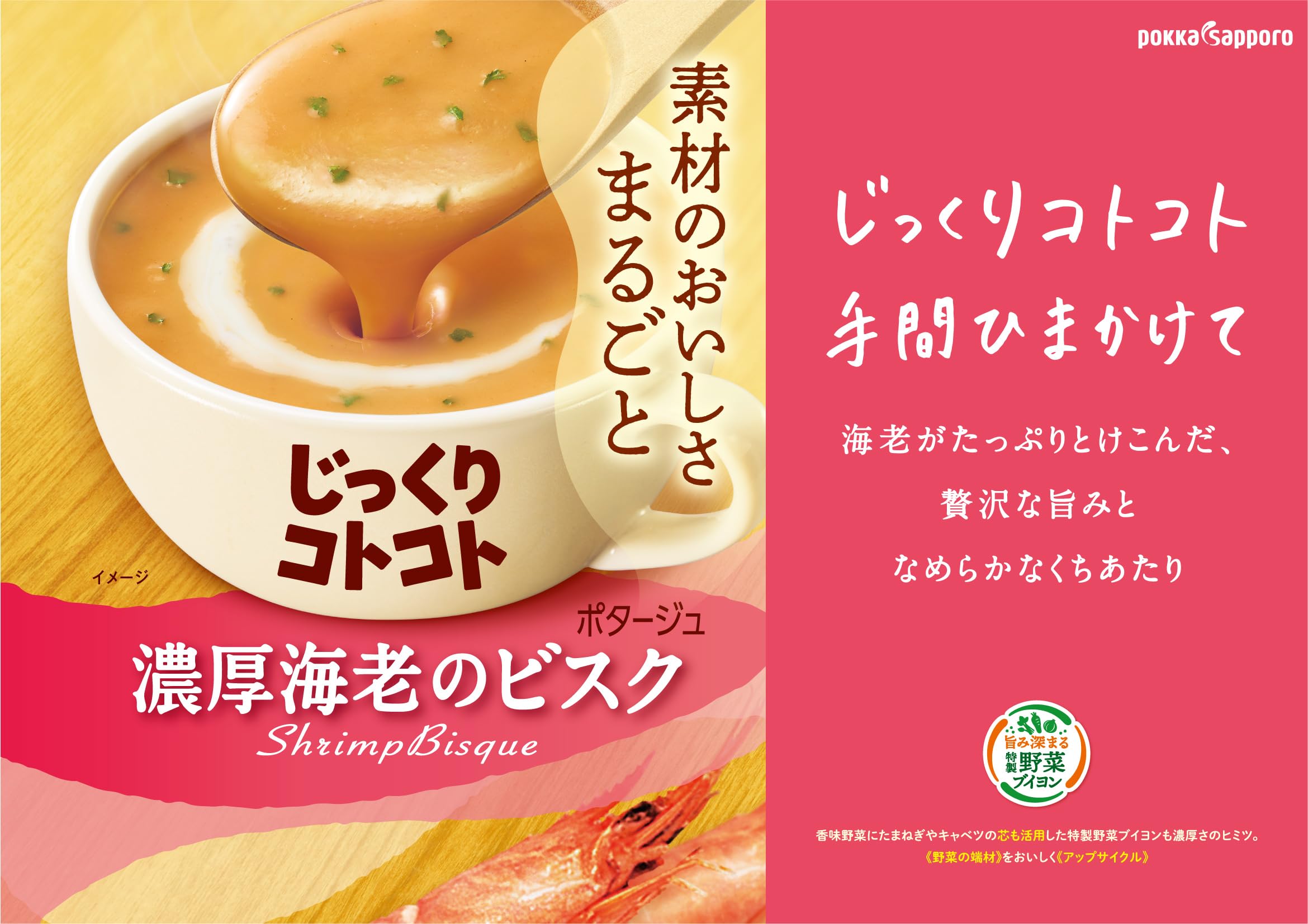 海老の旨みがたっぷりとけこんだ、濃厚クリーミーな海老のビスクです。海老のみ そのような深みのある贅沢な旨みとなめらかなくちあたりで、素材のおいしさをま るごと味わえます。たまねぎやキャベツの芯も活用した特製野菜ブイヨンも濃厚さ のヒミツ。