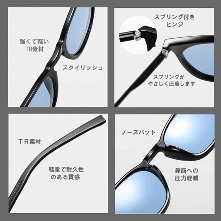 超軽量約22g・快適フィット:アルミマグネシウム合金の蝶番とTR90素材を組み合わせ、わずか約22gの軽さを実現。