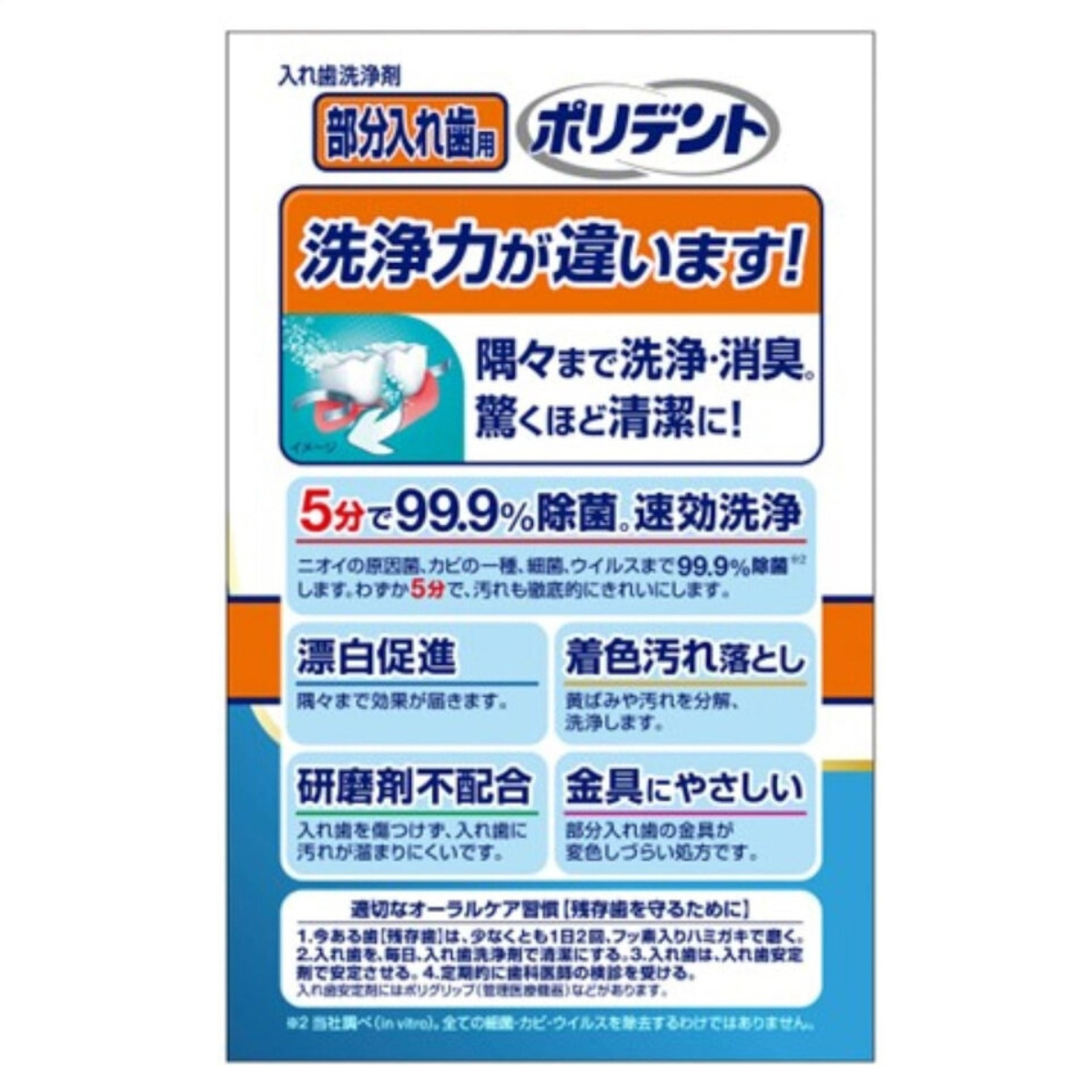 ・強力除菌:一日中使った入れ歯に繁殖したカビの一種やニオイの原因菌を99.9%*除菌します。*GSK調べ(in vitro)・速効洗浄:1回目からの使用でも、洗浄時間わずか5分で入れ歯を徹底的にきれいにします。・漂白促進:入れ歯の表面の見えない小さな穴まで効果が行き渡ります。・着色汚れ落とし:傷つけずに、入れ歯についたしつこい着色汚れを落とします。(研磨剤不配合処方)